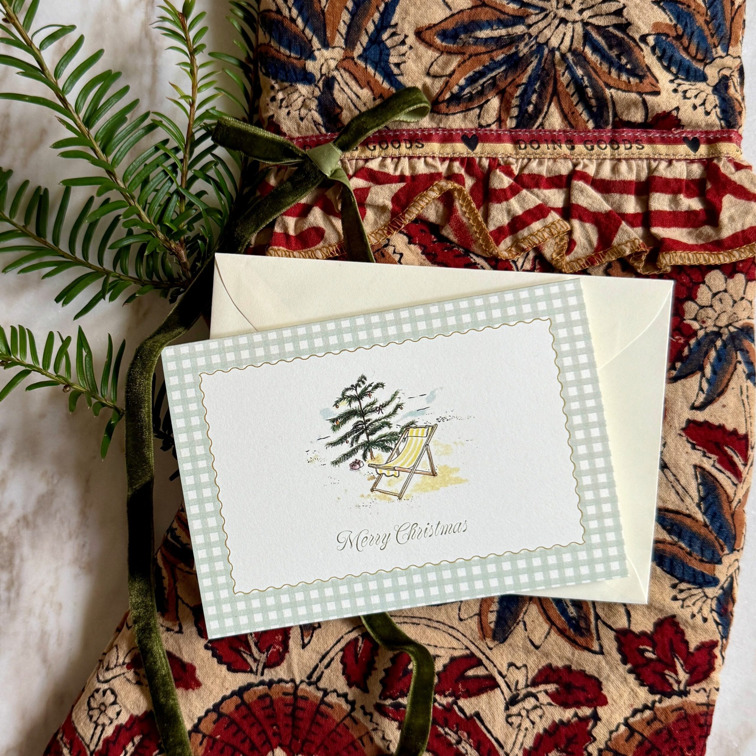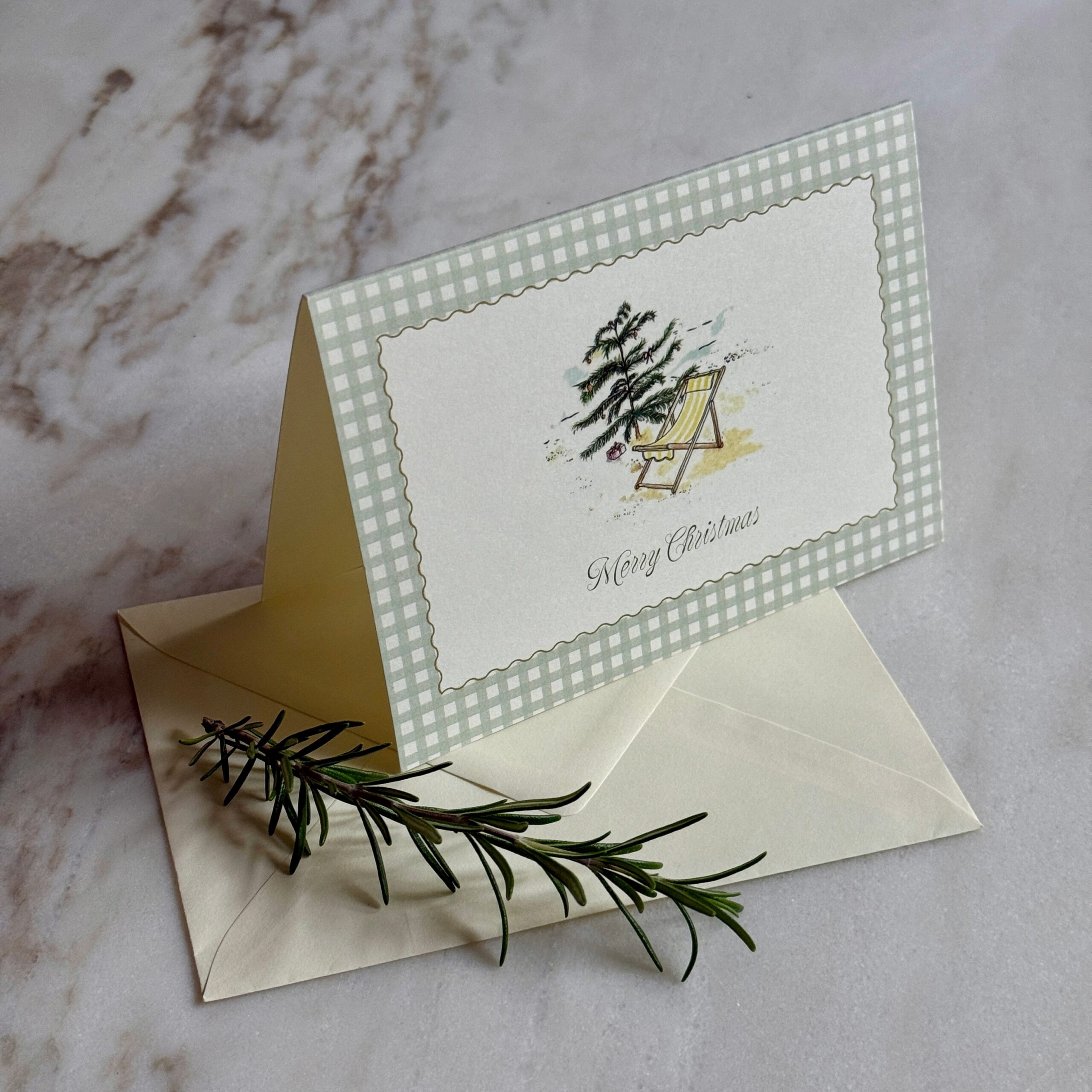 „Christmas Escape“ ist eine liebevoll gestaltete Klappkarte mit einer Illustration. Das Motiv zeigt einen Weihnachtsbaum am Strand neben einem Liegestuhl – ein stiller Hinweis darauf, dass man sich inmitten des Festtrubels manchmal einfach nach einer kleinen Auszeit sehnt.
